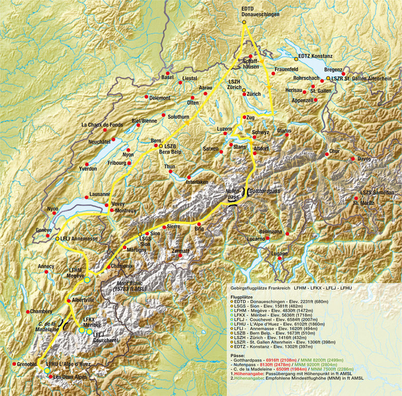 Der Gotthardpass wird mit der in der ICAO Karte 1:500000 Schweiz entnommenen Mindestüberflughöhe von 8200ft MSL überflogen.